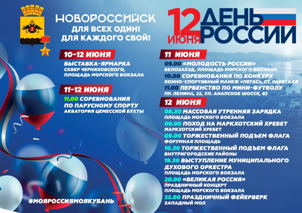 12 июня вся страна отмечает День России, а с 11 по 13 июня в Новороссийске состоится открытие туристического сезона. В честь этих событий в городе пройдет целый ряд праздничных мероприятий, о которых мы расскажем ниже.
